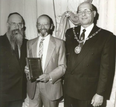 Arnold Berkley (centre) with Rabbi Chaim Jacobs (left). In a photo posted to Facebook by Chaim Jacobs on 20 June 2024.Source