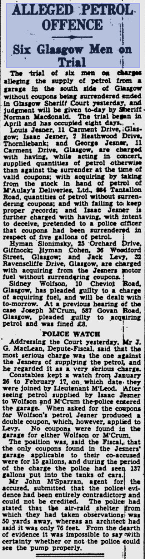 'Alleged petrol offence: Six Glasgow men on trial', Glasgow Herald, 8 October 1942. Among the accused were Isaac Jesner, Louis Jesner and George Jesner. their accomplices included Hyman Slonimsky, Hyman Cohen, Jack Levy, Joseph McCrum and Sidney Wolfson.