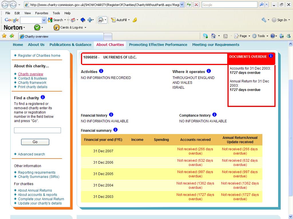 As of 24 July 2009, UK Friends of IDC had not filed any information with the UK Charity Commission,[18] and its accounts were 1727 days overdue[19] Subsequently, the charity started to report its accounts more regularly, which are as follows: